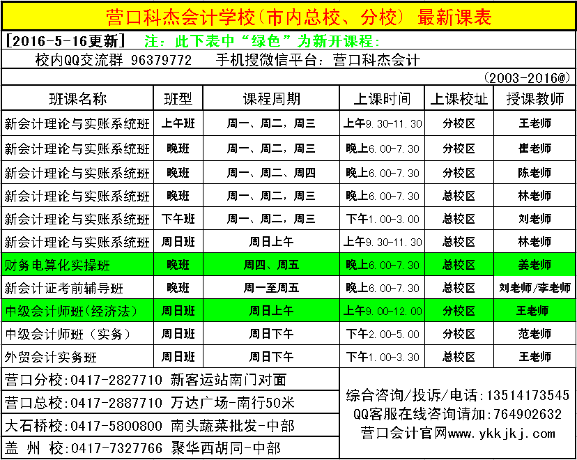[2016-5-16更新]营口科杰会计各校正在进行最新课表
