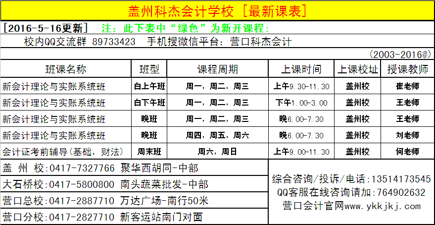[2016-5-23更新]营口科杰会计各校区正在进行最新课表