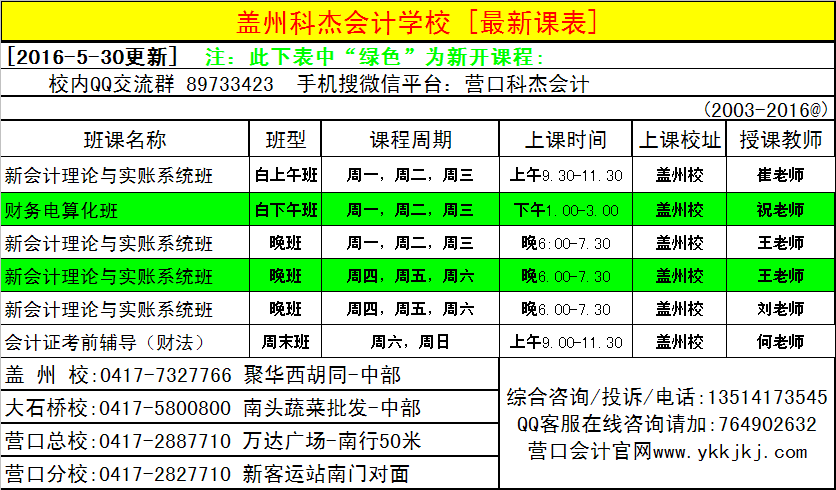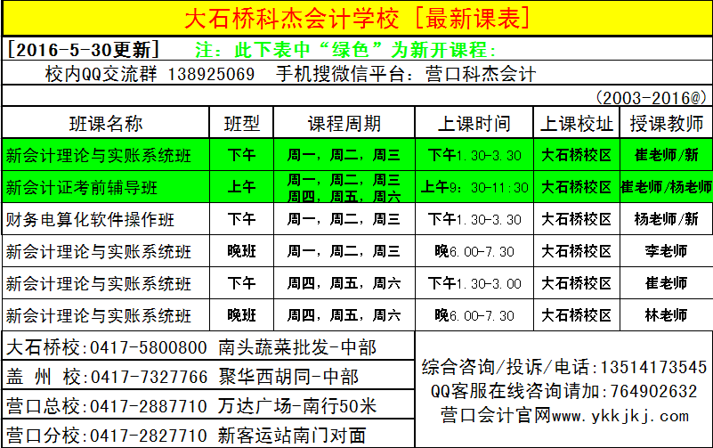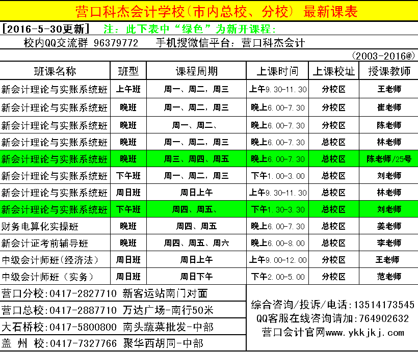 [2016-5-30更新]营口科杰会计各校区正在进行最新课表