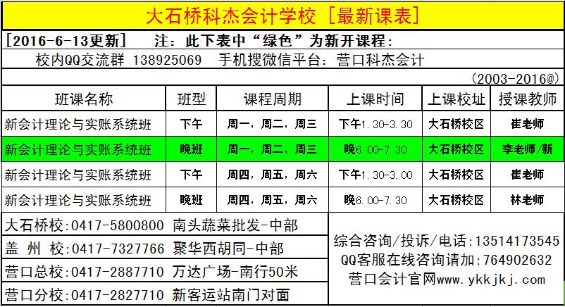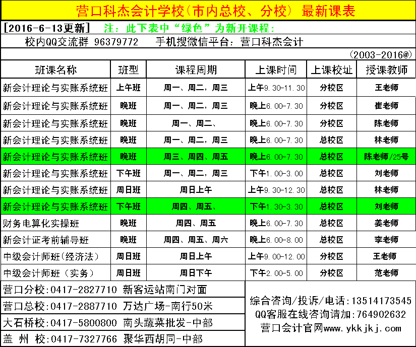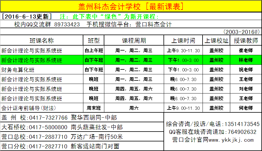 [2016-6-13更新]营口科杰会计各校区正在进行最新课表