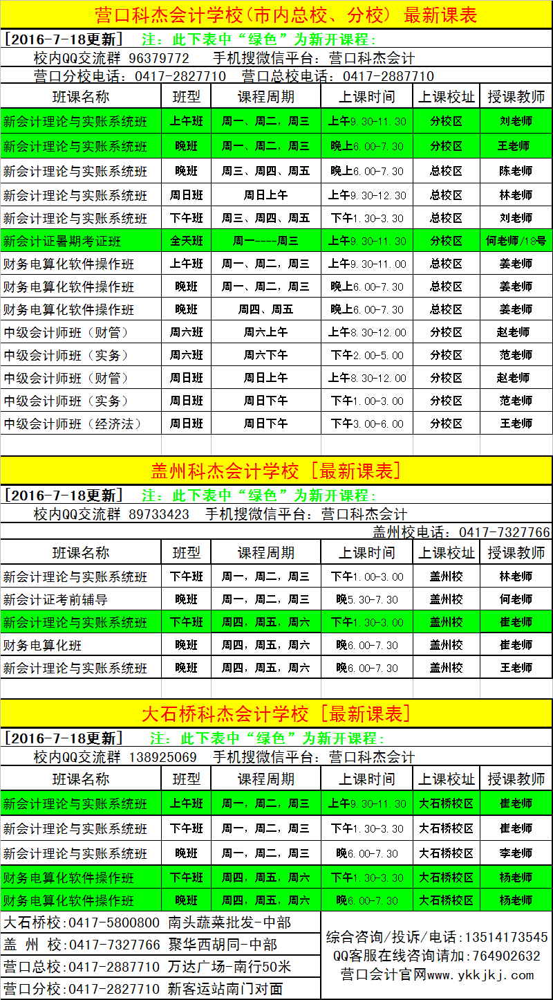 [2016-7-18更新]营口科杰会计各校区正在进行最新课表
