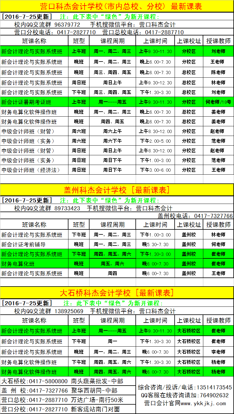 [2016-7-25更新]营口科杰会计各校区正在进行最新课表