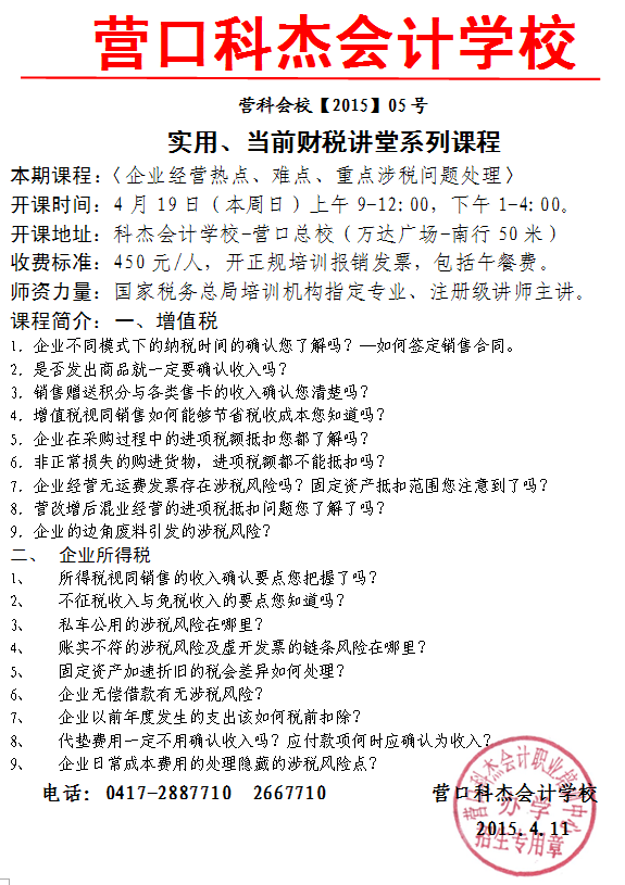 开课地址:科杰会计学校-营口总校(万达广场-南行50米)